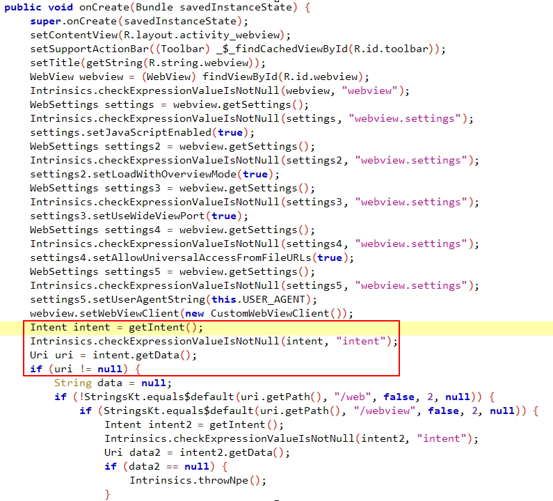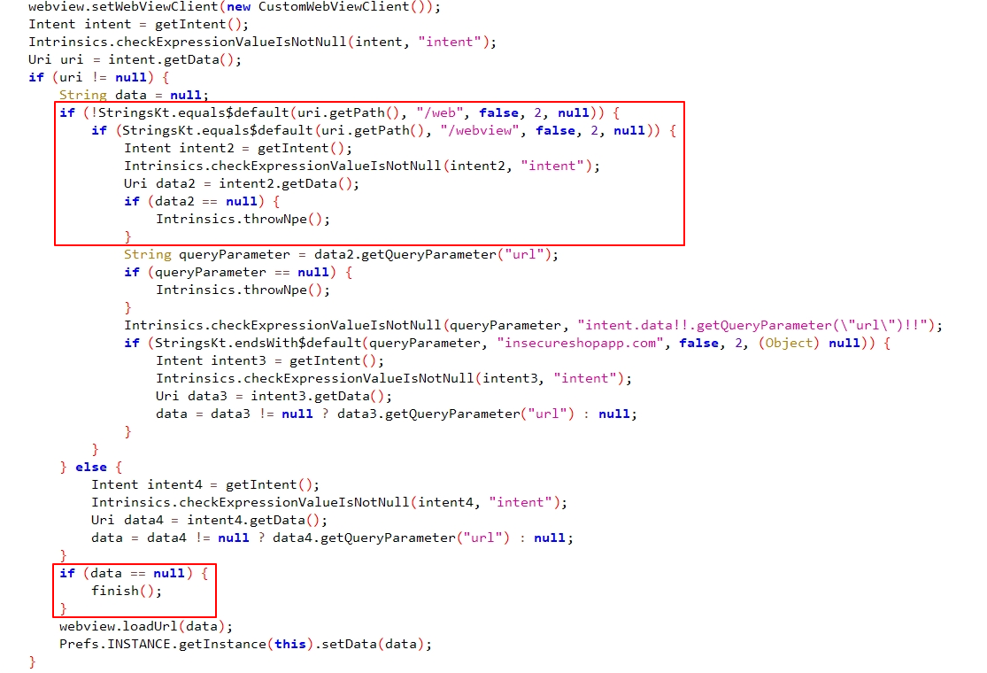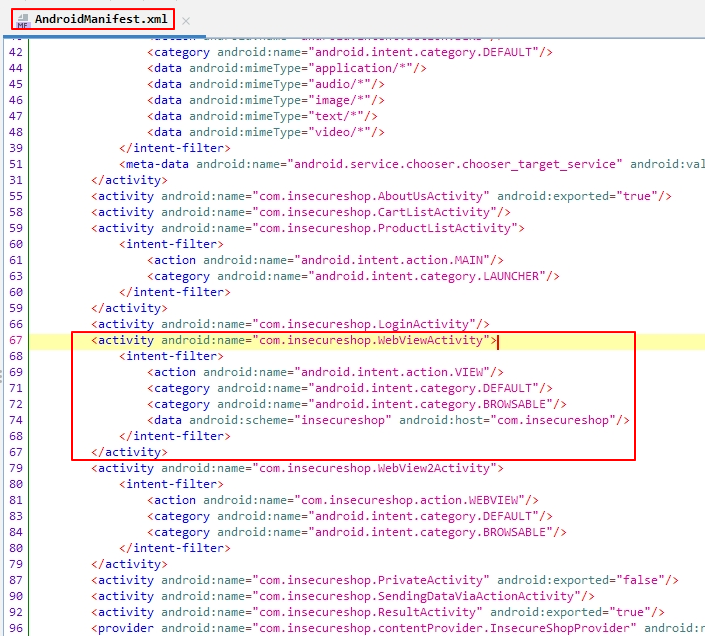 data 태그에 host가 com.insecureshop, scheme이 insecureshop로 정의됨을 확인