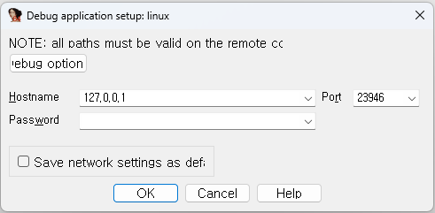 - 에뮬레이터 -> Remote Linux debugger, 단말기일 시 -> Remote ARM Linux/Android debugger 연결