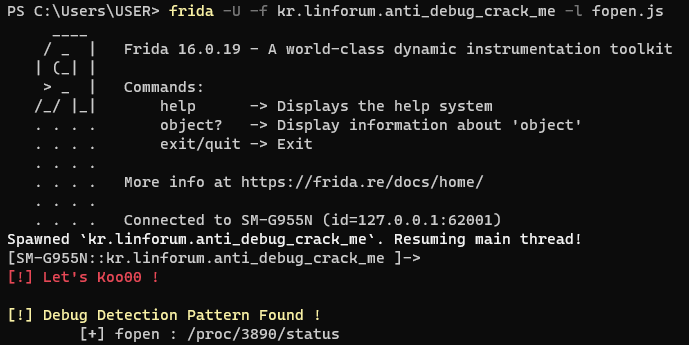 frida -U -f kr.linforum.anti_debug_crack_me -l fopen.js